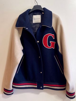 Chaqueta estilo universitario de la marca Gant. Combina un diseño clásico con detalles modernos. -Corte normal -Largo por la cadera - Bajo y puños acanalados - Mangas de color beige. - Cuerpo principal en azul marino. - Insignia G de rizo en el pecho. - Puños y cintura con rayas. - Cierre de botones a presión. Esta emblemática chaqueta universitaria presenta corte normal y largo hasta la cintura para lucir una silueta realmente clásica. Se ha diseñado con cierre de botones de presión en la parte delantera, manga raglán, bolsillos laterales con vivo y dos bolsillos con vivo en la parte interna. N.º de artículo 7325707465130