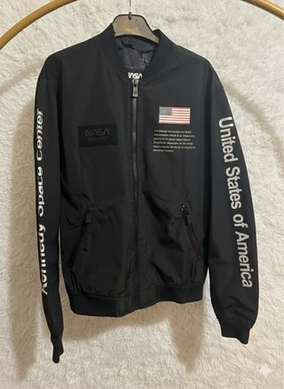 Chaqueta bomber negra con diseño inspirado en la NASA. - Parche de la NASA en el pecho. - Bandera de Estados Unidos - Texto United States of America en la manga. - Texto Kennedy Space Center en la otra manga.