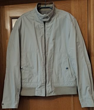Cazadora de entretiempo de Massimo Dutti en color beige arena, talla M. Está en muy buen estado y confeccionada en una cómoda mezcla de algodón y poliéster. Presenta un diseño clásico con cuello de doble botón, bolsillos laterales con cierre metálico y cintura elástica para un ajuste perfecto. Es una prenda versátil, impecable y lista para usar. Envío rápido.