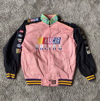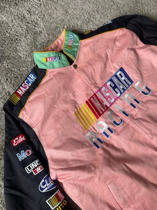 Chaqueta Original estilo bomber de NASCAR con un diseño llamativo en rosa y negro. Presenta detalles bordados y un cuello distintivo.
