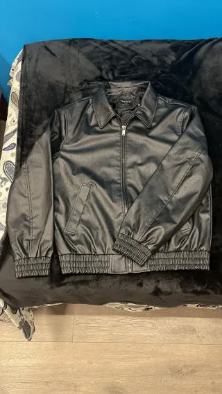 Chaqueta estilo bomber de cuero sintético. - Cierre de cremallera frontal. - Dos bolsillos laterales. - Puños y bajo elásticos.