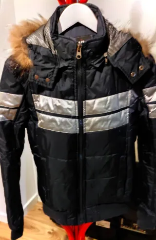 Chaqueta acolchada con un diseño moderno y detalles llamativos. - Ribete de pelo sintético en la capucha. - Rayas plateadas decorativas en el frontal y mangas. - Cierre de cremallera frontal.Chaqueta acolchada azul y ribete de pelo sintetico en la capucha.comoda ,caliente e impermeable.ideal para invierno y otoño.Las medidas están en las fotos