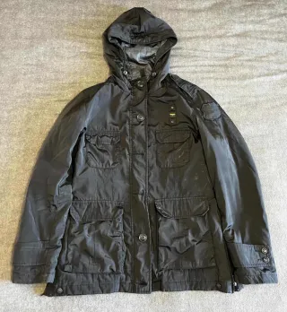 Cazadora Blauer de color negro, con un diseño moderno y funcional. - Capucha integrada. - Múltiples bolsillos frontales. - Cierre de botones y cremallera. - Puños ajustables con botones.