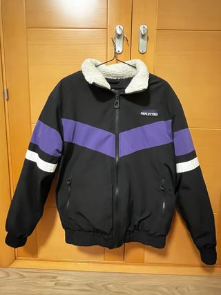 Chaqueta estilo bomber con un diseño moderno y llamativo. - Cuello de pelo sintético. - Detalle de cheurón morado en el pecho. - Rayas blancas en las mangas. - Cremallera frontal. - Bolsillos laterales con cremallera.