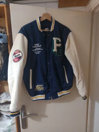 Oportunidad , estás en moda!!! Chaqueta estilo bomber de Pull&Bear. - Diseño con mangas de diferente color. - Detalle de parches y bordados. - Cuello y puños con rayas. Poco usado, su desgaste sera de estar colgada se acabará pelando pq no es piel, pero está limpia pq no se ha usado casi... El desgaste no es de uso es de que es plástico y con el tiempo se va ir pelando, oportunidad para usar ya que todavía está decente!!!
