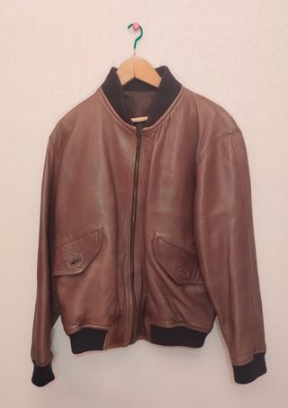 Cazadora de aviador de cuero(piel) de la marca Schott. Modelo 184SM - Cuello de pelo desmontable - Bolsillos delanteros con solapa. - Puños y cintura de punto elástico. - Forro pelo desmontable Medidas , Pecho: 60 cm, Largo : 65 cm, Hombro a Hombro: 55 cm, Largo: 65 cm. Talla 46. Precio de nueva 1ooo$ Esta muy poco usada, tiene un par de zonas ligeramente decoloradas (muy poco) en la zona interna de las mangas, mando más fotos sin problema