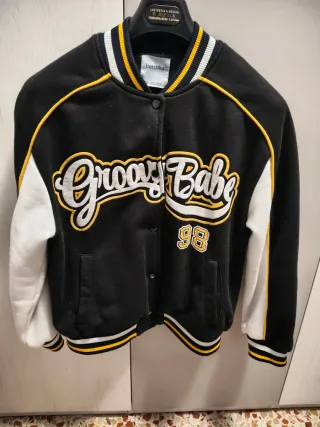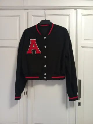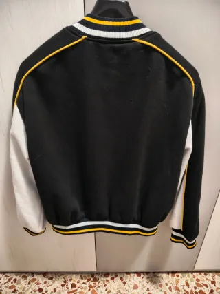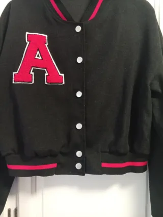 📌 Cazadora Bomber beisbolera negra de Bershka. 📌 Muy buen estado. 📌 Forrada y con botones de presión. 📌 Talla XS (50 cms de hombros, 50 cms entre axilas y 45 cms de largo).