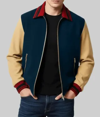 Chaqueta bomber inspirada en Stranger Things. Diseño con mangas de color beige y cuerpo azul. - Cuello y puños con detalles de rayas rojas y negras. - Cierre de cremallera frontal. - Bolsillos laterales con cremallera.