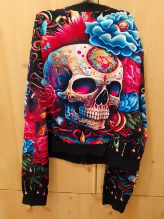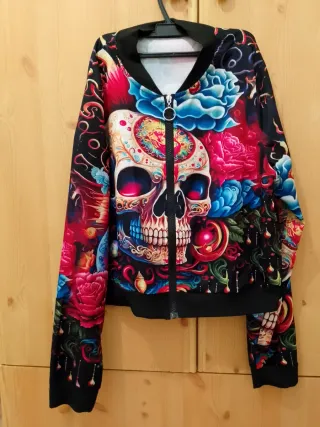 Chaqueta estilo bomber con un llamativo diseño. - Estampado integral de calavera y flores. - Cierre de cremallera frontal. - Puños y bajo elásticos.