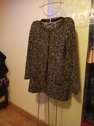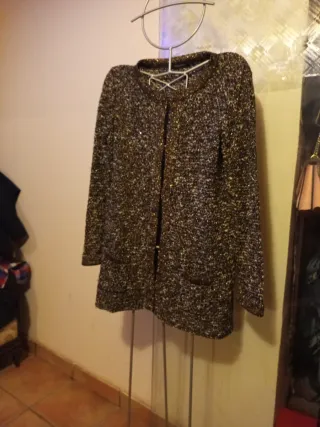 Elegante chaqueta de Pedro del Hierro con un diseño texturizado que combina negro y dorado. Perfecta para añadir un toque sofisticado a cualquier atuendo. - Tejido con hilos dorados. - Cuello redondo. - Cierre frontal.