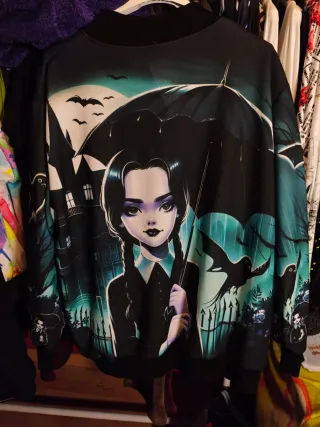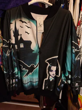 Chaqueta bomber con estampado de Miércoles Addams. - Diseño inspirado en la temática gótica y de Halloween. - Estampado frontal y trasero. - Cremallera completa. Talla Curvy, hasta una 52 -54