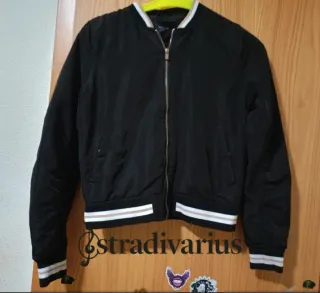 Chaqueta tipo bomber de Stradivarius en color negro. Tiene detalles de rayas blancas y beige en el cuello, puños y cintura, lo que le da un toque deportivo/varsity. Interior acolchado ligero (perfecta para entretiempo), cierre de cremallera frontal y bolsillos laterales. Combina con todo.