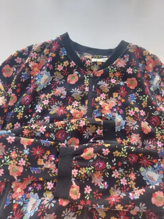 Chaqueta bomber con un vibrante estampado floral sobre fondo negro. Presenta un diseño moderno y llamativo. - Cierre de cremallera frontal. - Puños y bajo elásticos. - Cuello redondo. La etiqueta es lo único que tiene "mal", está un poco amarillenta por el paso del tiempo.