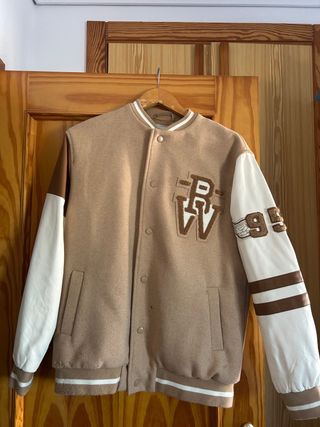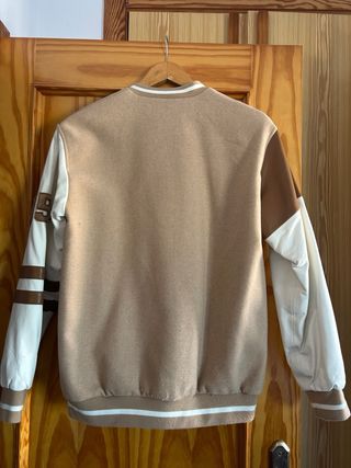 Chaqueta estilo bomber con mangas de diferente color. - Cuerpo principal en color beige. - Mangas en color blanco y marrón. - Detalle de parches y número '95' en una manga. - Cuello, puños y bajo con rayas blancas y marrones.
