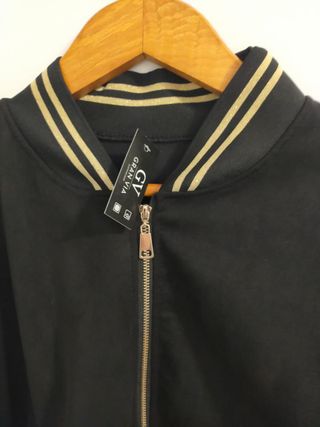 Chaqueta bomber de estilo urbano con un diseño moderno. - Cuello y puños con banda elástica de rayas doradas. - Cremallera frontal dorada. - Bajo con banda elástica y rayas doradas.