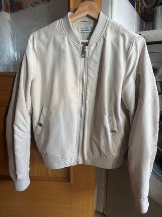 Chaqueta estilo bomber de la marca Bershka. Presenta un diseño acolchado en el interior.Un pequerña marca en La espalda que apenas se nota. Pone XL pero se puede llevar overside si tienes talla S, M y L. - Cierre de cremallera frontal. - Dos bolsillos laterales con botón a presión. - Puños y bajo elásticos.