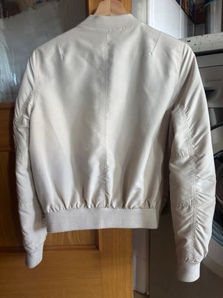 Chaqueta estilo bomber en color beige. - Cierre de cremallera frontal. - Bolsillos laterales con botón. - Puños y bajo elásticos.