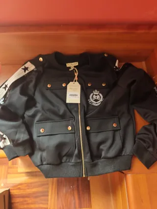 Chaqueta estilo bomber con detalles llamativos. - Diseño en color negro con detalles multicolores. - Adornada con estrellas y lentejuelas en las mangas. - Cierre de cremallera dorada. - Bolsillos frontales con botones dorados.