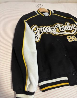Chaqueta estilo varsity con un diseño llamativo. - Mangas y cuello con detalles a rayas amarillas. - Inscripción Match Day en la parte delantera. - Pequeño parche Last Call en el pecho izquierdo. - Frase Do Everything To Get It en el pecho derecho. - con bolsillos y cierre de botones