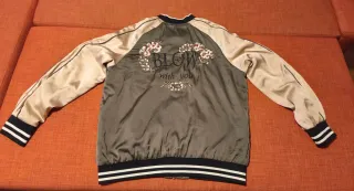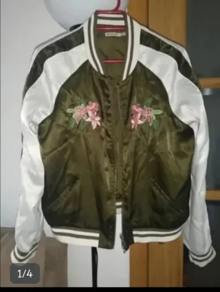 Chaqueta bomber con un diseño floral bordado en la espalda. Las mangas son de un color beige satinado y el cuerpo principal es de color verde. - Bordado floral en la espalda. - Cierre de cremallera. - Puños y cuello elásticos.