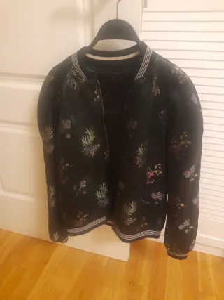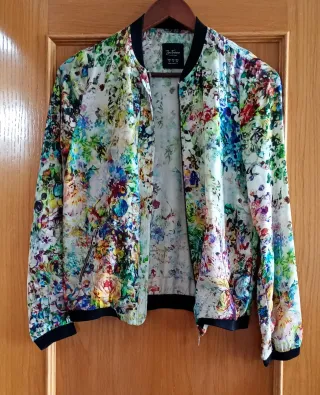 Bomber con un vibrante estampado floral, con cremallera. Para entretiempo.Es preciosa. - Mangas largas. - Puños y bajo elásticos. - Bolsillos con cremalleras. Está nueva ,sin etiqueta.Solo una puesta porque me quedaba muy justa.Es talla S