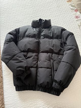 Chaqueta bomber de la marca Bershka en color negro. Es una prenda de abrigo con un diseño acolchado. - Cuello alto. - Cierre de cremallera. - Puños y bajo elásticos.