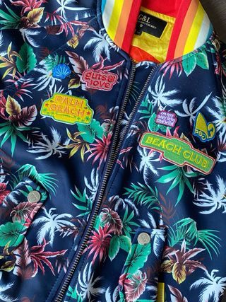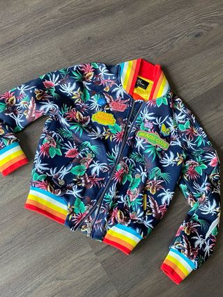 Chaqueta bomber con un vibrante estampado tropical y detalles coloridos. - Diseño con parches temáticos. - Cuello y puños con rayas arcoíris. - Cierre de cremallera frontal.