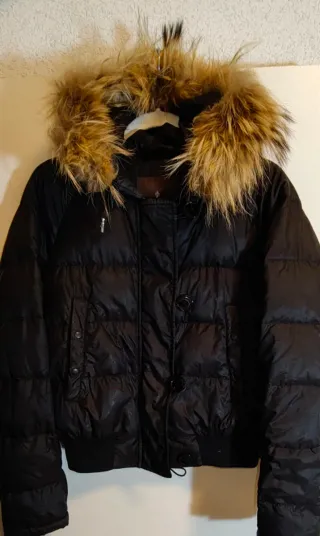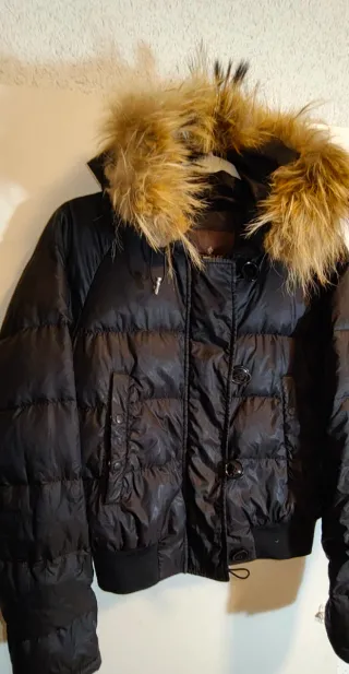 Abrigo estilo bomber para mujer. Acolchado tipo plumas, capucha con pelos ajustable por discreto cordón, cremallera tipo marinero frontal con solapa que lo oculta y botones no a presión, dos bolsillos frontales uno a cada lado y botones de la marca, un bonito y discreta prenda imprescindible... - Diseño acolchado. - Capucha con pelo animal. - Cierre de botones. En tienda cuesta más de 1000€...