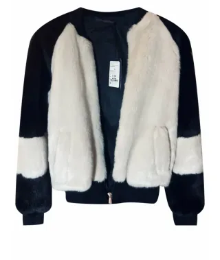 Chaqueta bomber de la marca Trussardi Jeans con un diseño bicolor. - Mangas y paneles frontales en pelo sintético. - Cuerpo y mangas en tejido negro. - Cierre de cremallera frontal. Necesitaría una limpieza, por lo demás, en perfectas condiciones