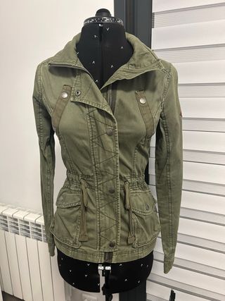 Chaqueta estilo militar de la marca Hollister. - Diseño con cordón ajustable en la cintura. - Bolsillos frontales con solapa. - Cierre de cremallera y botones. - Cuello alto con detalle de trabillas.