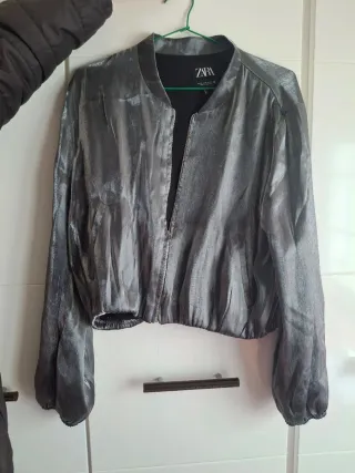 Chaqueta Bomber Zara Gris Metalizado Talla XL