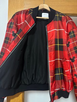 Chaqueta bomber con estampado de cuadros y detalles de Mickey Mouse. - Diseño de cuadros rojos, negros y amarillos. - Siluetas de Mickey Mouse a lo largo de las mangas y el cuerpo. - Cuello, puños y bajo elásticos en negro. -Modelo talla S oversize estilo Bomber. -Tejido suave dentro y fuera. -Edición limitada Disney para Bershka.