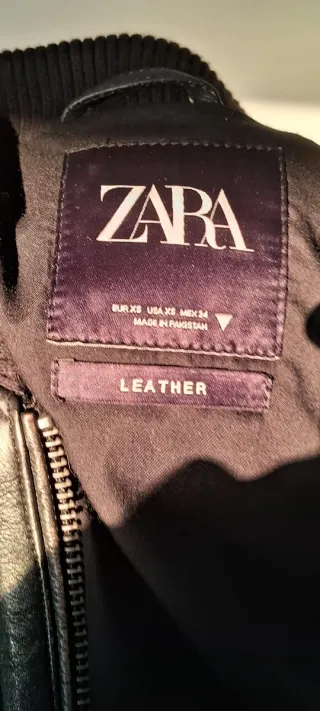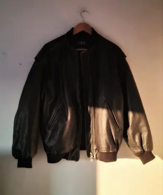 Chaqueta estilo bomber de Zara con un acabado que imita la piel. - Cierre de cremallera. - Bolsillos frontales con cremallera. - Puños y cuello elásticos.