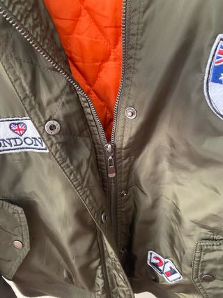 Chaqueta bomber muy ponible con un diseño llamativo. - Forro interior de color naranja. - Parches decorativos. - Cierre de cremallera.