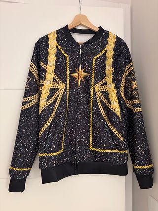 Chaqueta con un diseño llamativo inspirado en el K-pop y estilo guerrero. - Estampado de cadenas doradas y estrella central. - Base de color negro salpicada con detalles multicolores. - Puños y cintura elásticos en negro.