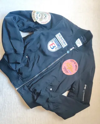 Chaqueta bomber azul estilo militar con varios parches. Talla S pero es como XS. Es gordita. REBAJADA