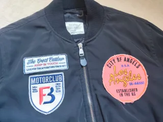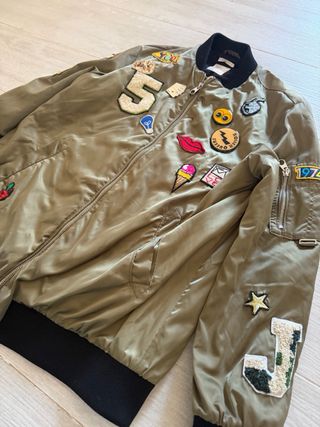 Chaqueta estilo bomber con múltiples parches decorativos. - Diseño con parches temáticos. - Cierre frontal con cremallera. - Puños y cintura elásticos.