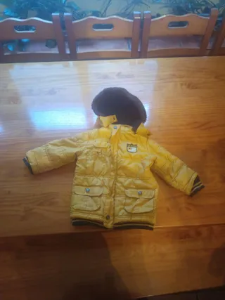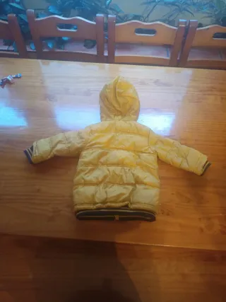 Cazadora infantil de color amarillo, ideal para los días más fríos. Cuenta con un diseño acolchado y una capucha forrada. - Capucha con forro de pelo. - Cierre de botones. - Dos bolsillos delanteros con solapa y botón. - Puños y bajo con banda elástica y detalles de rayas.talla 12/18 meses