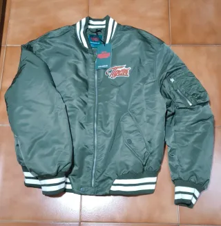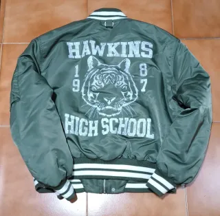 Chaqueta bomber de Pull&Bear inspirada en Stranger Things. - Descatalogada. - Color verde oliva. - Diseño tipo bomber. - Detalle de parche Tigers en el pecho. - Estampada en la espalda. - Puños y cuello con rayas blancas.