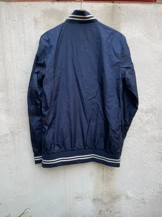 Chaqueta estilo varsity con mangas de diferente color. - Cuerpo principal en azul marino. - Mangas en blanco. - Cuello y puños con rayas. - Cierre de botones a presión. - Bolsillos laterales. Talla M.