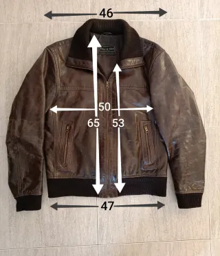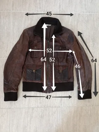 Más prendas de cuero en mi perfil. Marca de prestigio. Bastante usada. Cuero de aspecto envejecido ya procedente de fábrica, pero acentuado por el uso. Puños zurcidos, arreglo poco notorio. Ver detalle en la última foto. Forro fino en muy buen estado. Cuero de búfalo de excelente calidad, flexible y muy resistente, uno de los de mayor calidad y precio. Grosor medio-grueso. Textura lisa. Color marrón. La etiqueta indica talla XL, pero es más bien una L. El modelo mide 1,74 y pesa 82 kgs. Medidas indicadas en las fotos. Preguntar cualquier información sin compromiso.