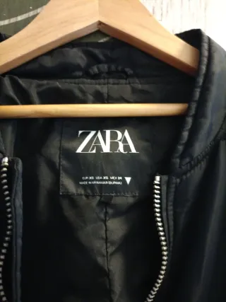 Bomber de la marca Zara en talla XS. Una prenda versátil y moderna. - Diseño tipo bomber. - Cierre de cremallera frontal. - Fabricada en Myanmar (Burma).