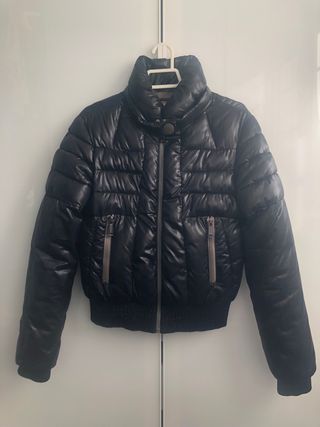 Cazadora de la marca El Ganso con un diseño moderno y versátil, prácticamente nueva,con plumón y resistente al agua (ver fotos), bolsillos interiores y exteriores. - Cuerpo acolchado (plumón) en color negro por delante y por detrás. - Mangas y cuello en tejido gris. - Cremallera frontal con detalles de colores pero sin capucha, el abrigo se repliega en esa cremallera.