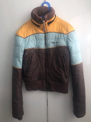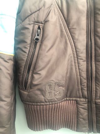 Cazadora de la marca El Ganso en color marrón, con plumas, repele el agua (ver fotos), casi nueva con 3 puestas. - Cuerpo acolchado por delante y por detrás. - Mangas de tejido. - Cuello alto. - Cierre de cremallera.