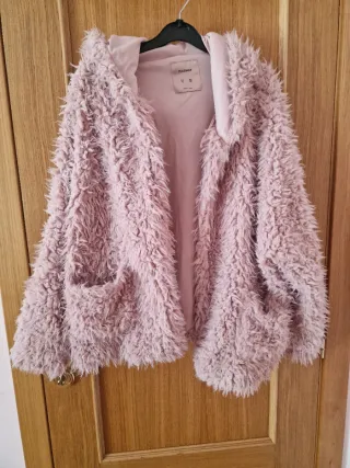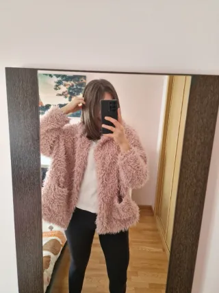 Chaqueta de pelo suave en color rosa. - Diseño bomber. - Cierre de cremallera. - Bolsillos laterales. - Esta un poco sobada en codos y muñecas, se ve en las fotos su estado.