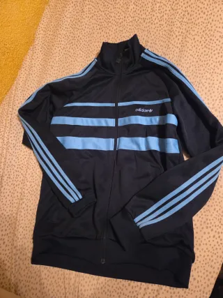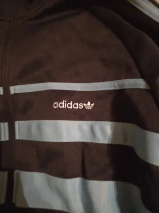 Chaqueta deportiva Adidas en buen estado. - Diseño con franjas azules en las mangas. - Logo de Adidas bordado en el pecho.