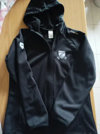 Chaqueta deportiva negra con cremallera frontal, con dos bolsillos con cremallera y capucha.Edad 11-12 años - Diseño con escudo bordado en el pecho. - Cremallera completa. - Capucha integrada.