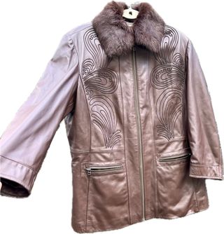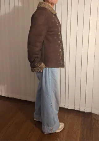 Chaqueta de piel auténtica con un diseño único. - Cuello y puños con pelo sintético. - Bordados florales en la parte delantera. - Cierre de botones. -Tiene pequeñas manchas de humedad por llevar mucho tiempo guardadas.