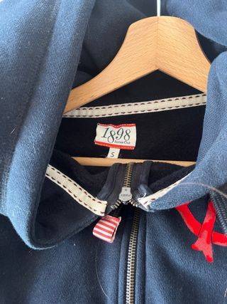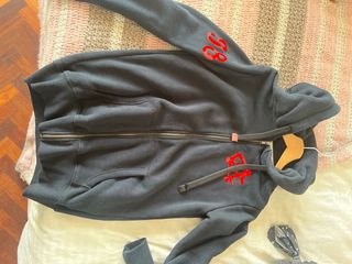 Chaqueta deportiva con cremallera completa y capucha. - Diseño con logo bordado en rojo en el pecho. - Detalle de número 98 en rojo en la manga. - Bolsillos frontales tipo canguro. - Cordones ajustables en la capucha.