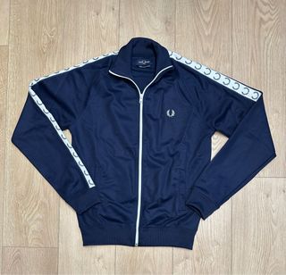 Chaqueta deportiva Fred Perry en color azul marino. Presenta un diseño clásico con detalles distintivos. - Logo de Fred Perry bordado en el pecho. - Raya con laureles en las mangas. - Cierre de cremallera frontal. - Puños y cintura elásticos.